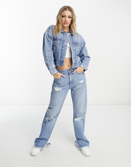 Stradivarius Veste en jean courte avec dechirures Bleu moyen